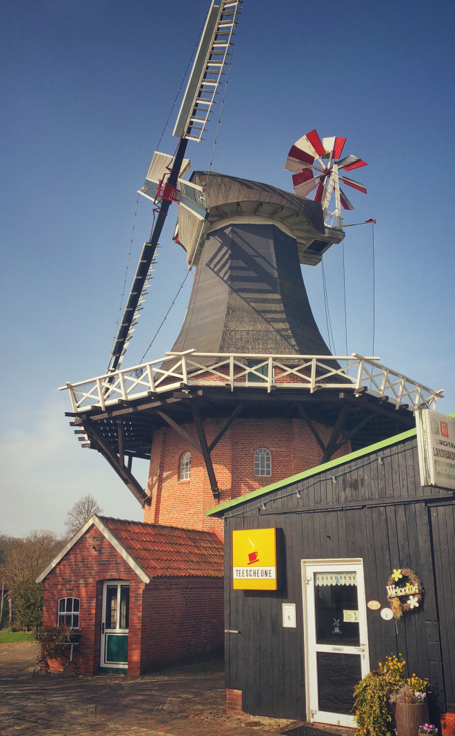 Dreistöckiger Galerieholländer mit Windrose, Getreidemühle, Gewerbebetrieb, 3 Schrotgänge, 2 Graupengänge, 1 Mahlgang, Die Mühle wurde 2001 vollständig wieder aufgebaut. Besichtigung nach Vereinbarung Die vier Müllerinnen sind gerne bereit, Ihnen mehr über das Müllerhandwerk zu erzählen. Bei Voranmeldung wird in der angrenzenden Teescheune nach Ihren Wünschen die Tee- oder Kaffeetafel bis zu einer Anzahl von 70 Personen gedeckt.